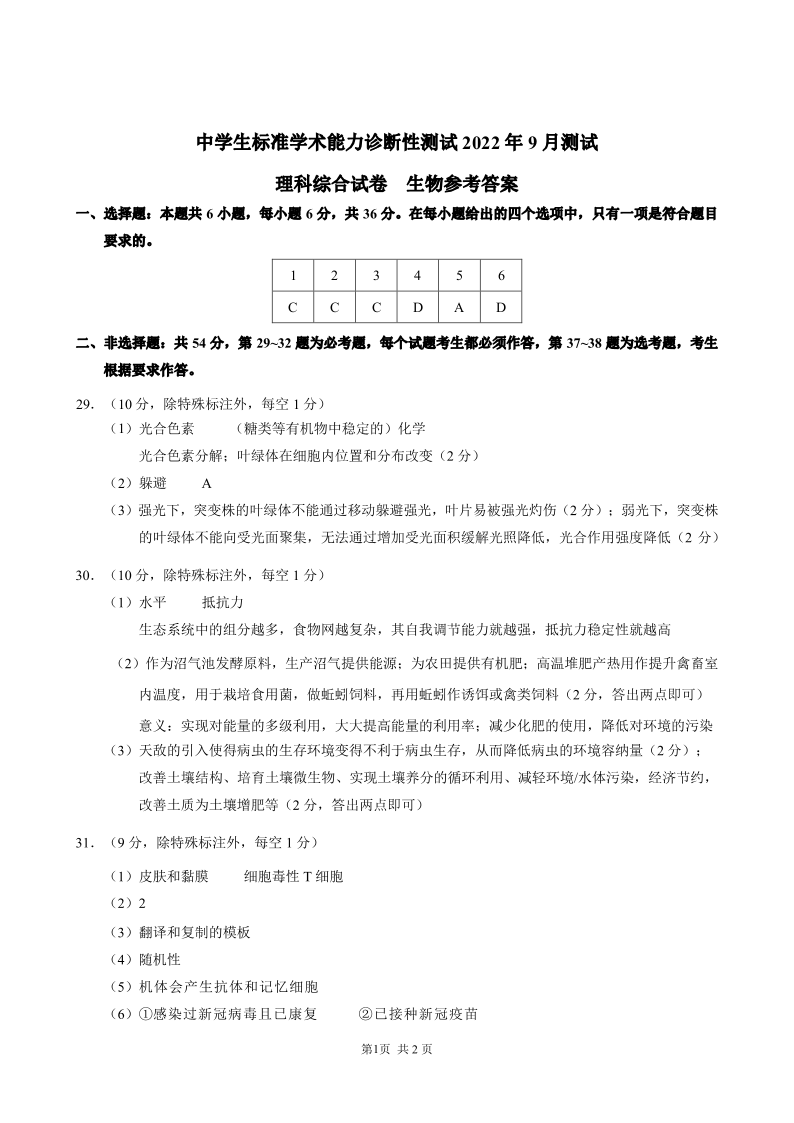 高三理综生物答案----2022年9月中学生标准学术能力诊断性测试测试