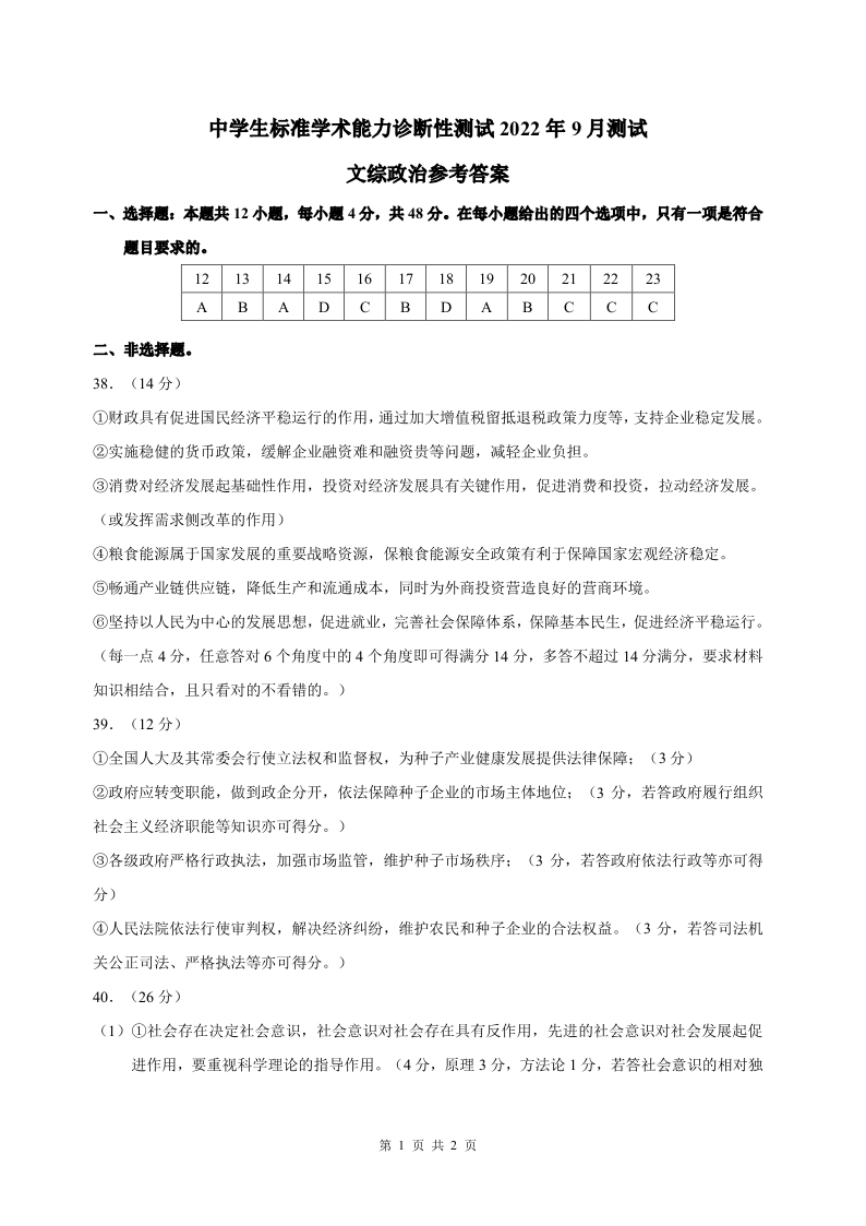 高三文综政治答案----2022年9月中学生标准学术能力诊断性测试测试