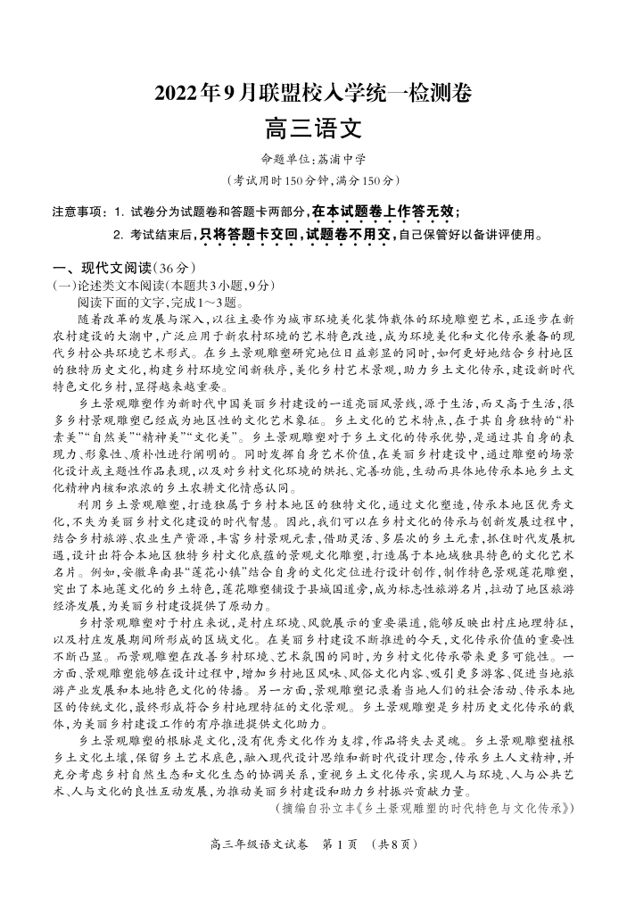高三语文--广西桂林联盟校2023届高三9月入学统一检测