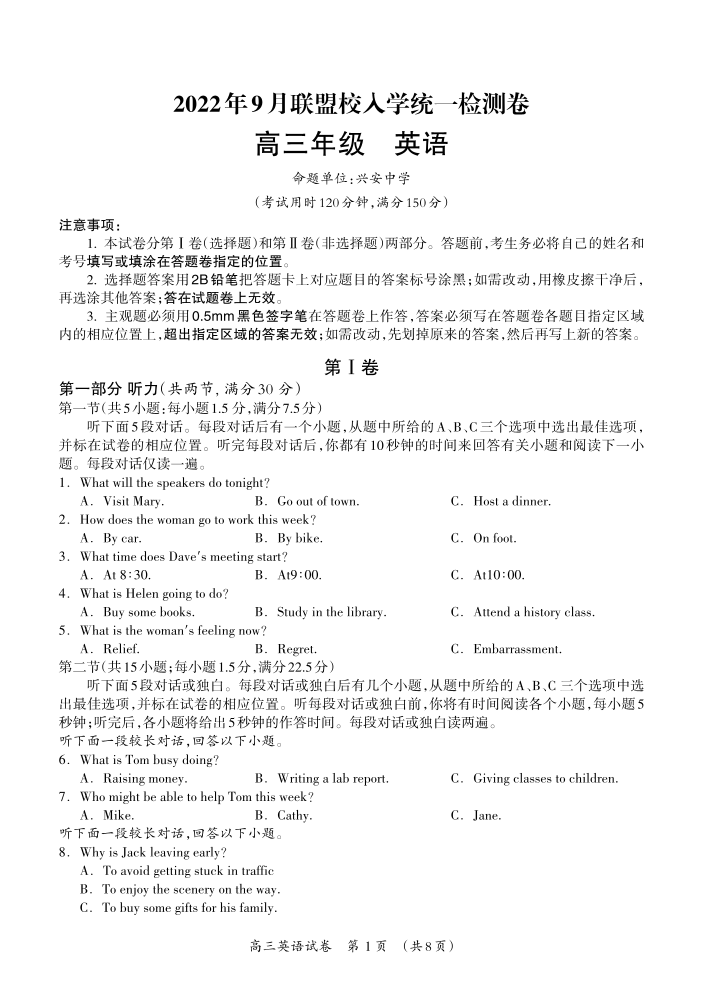 高三英语--广西桂林联盟校2023届高三9月入学统一检测