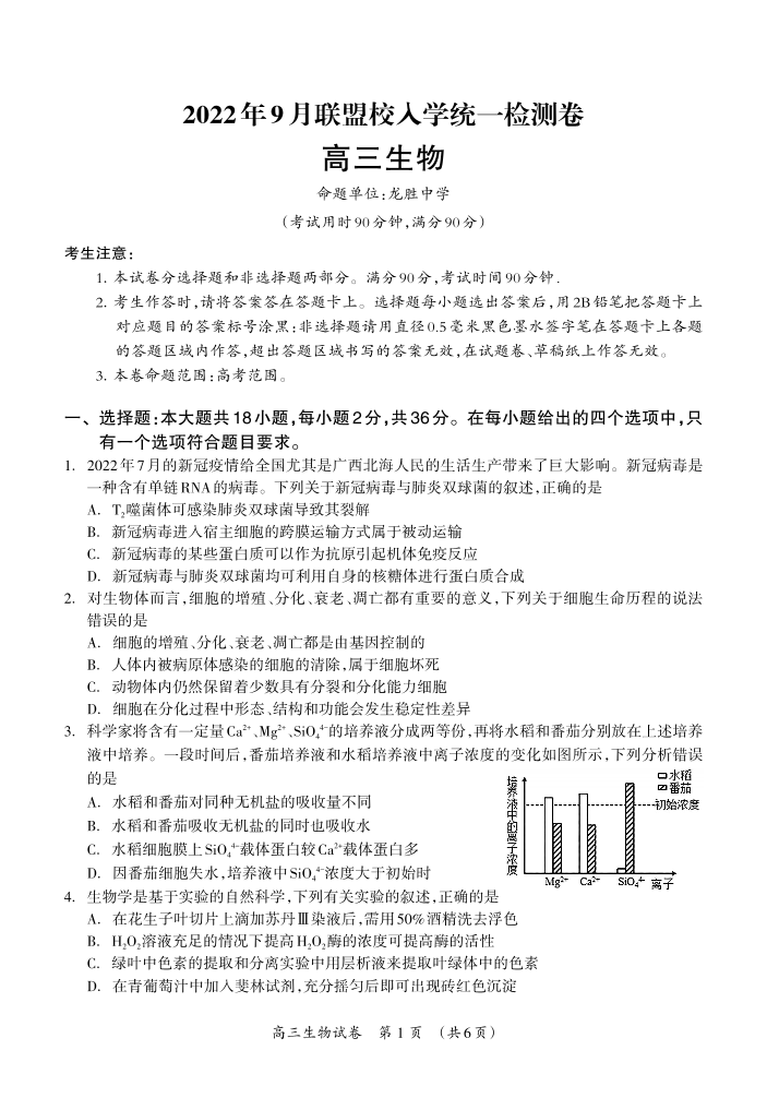高三生物--广西桂林联盟校2023届高三9月入学统一检测