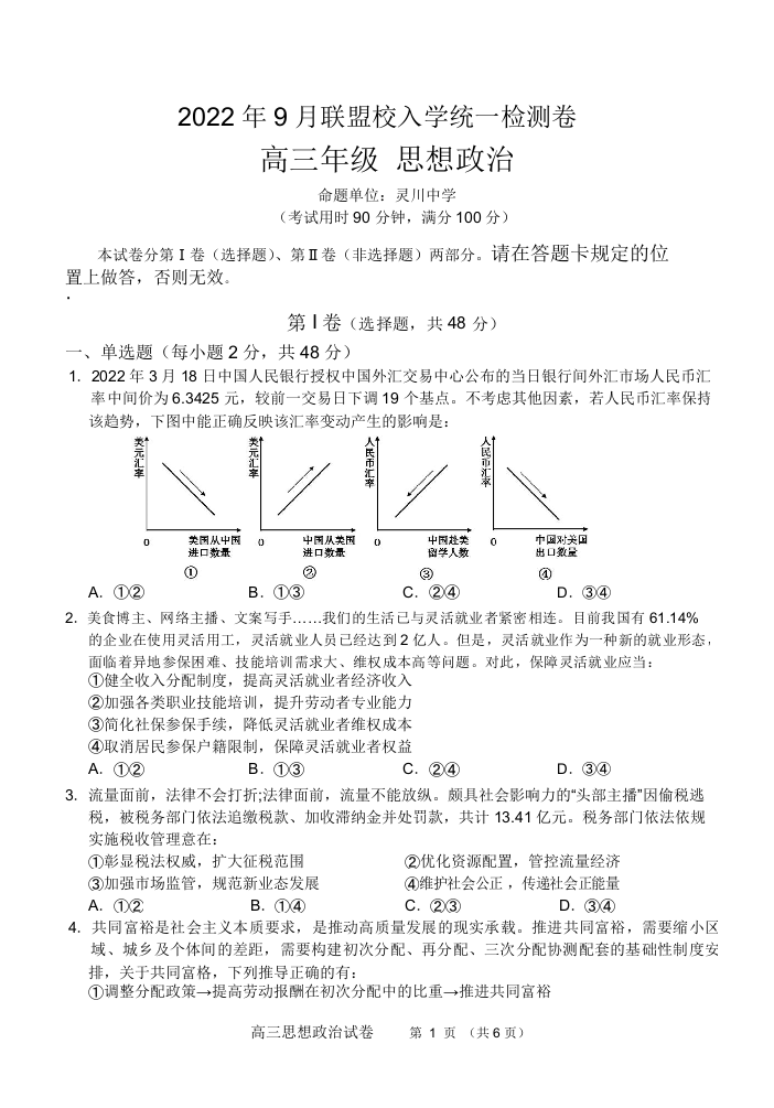 高三政治--广西桂林联盟校2023届高三9月入学统一检测