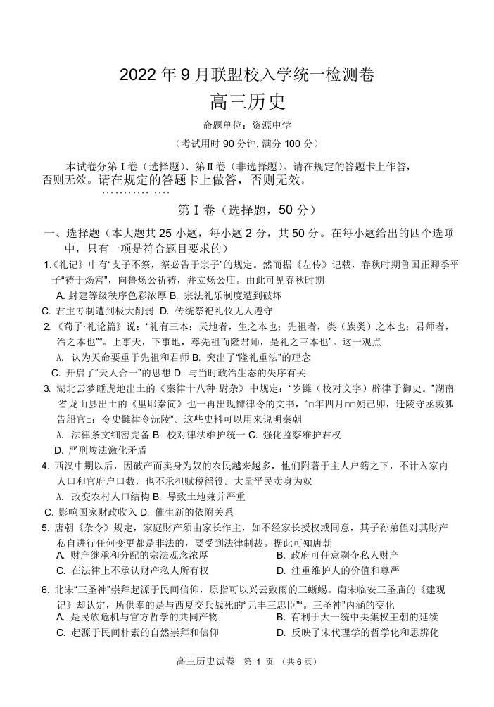 高三历史--广西桂林联盟校2023届高三9月入学统一检测