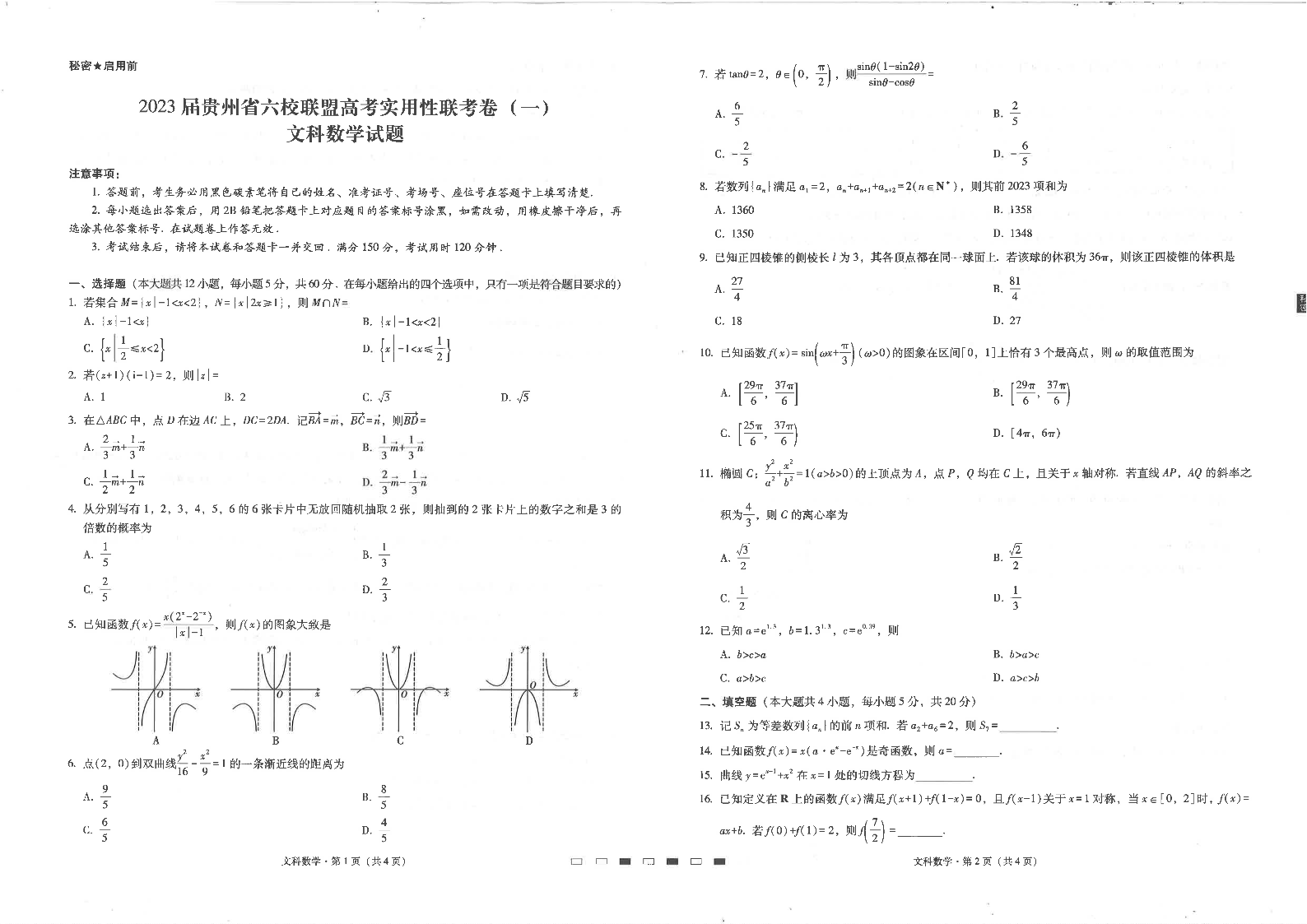 高三文数--贵州省六校联盟2023届高三上学期高考实用性联考(一)