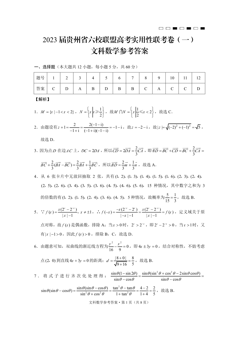 高三文数答案--贵州省六校联盟2023届高三上学期高考实用性联考(一)