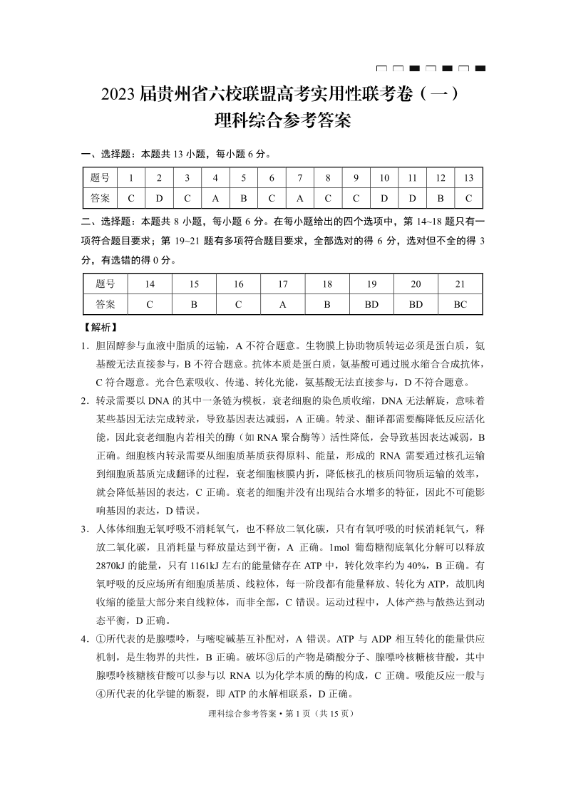 高三理综答案--贵州省六校联盟2023届高三上学期高考实用性联考(一)