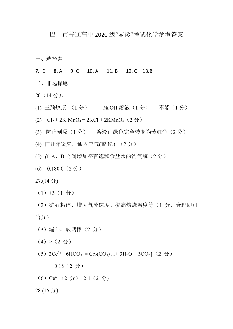 高三理综化学答案--四川省巴中市2023届高三零诊