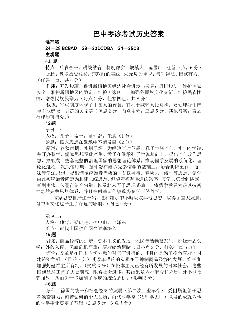 高三文综历史答案--四川省巴中市2023届高三零诊