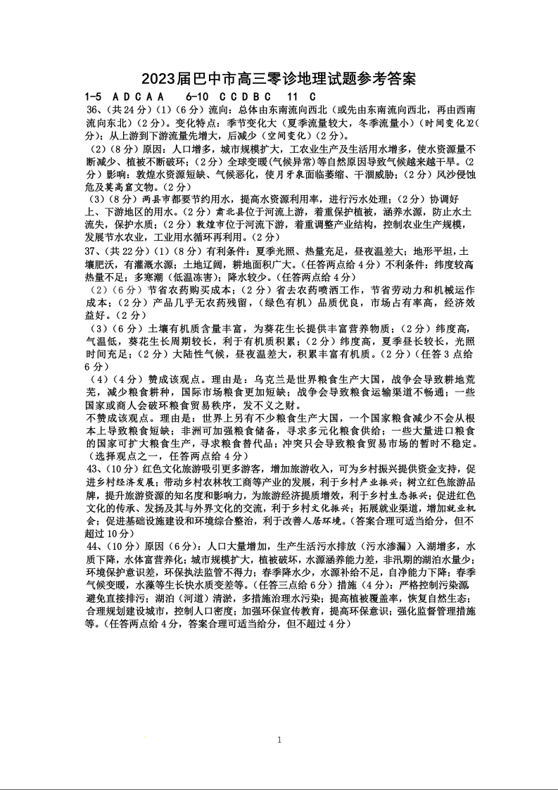 高三文综地理答案--四川省巴中市2023届高三零诊