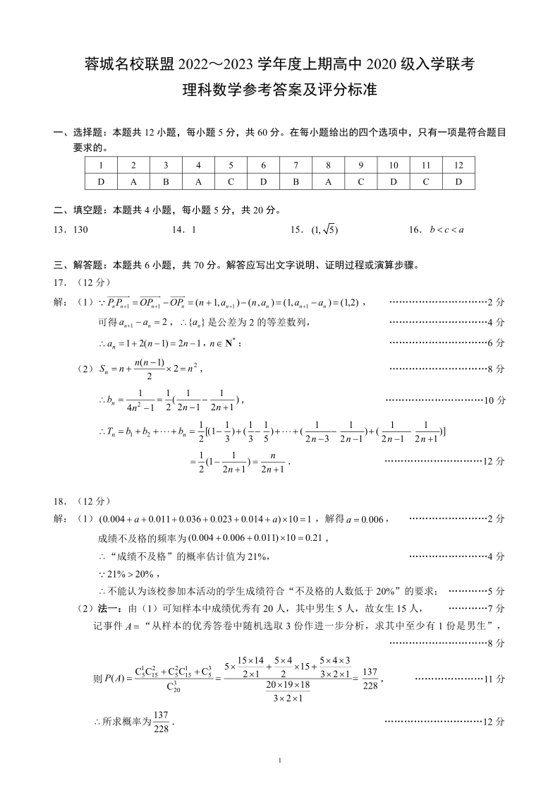高三理科数学答案--四川省蓉城名校联盟23届高三上学期入学联考
