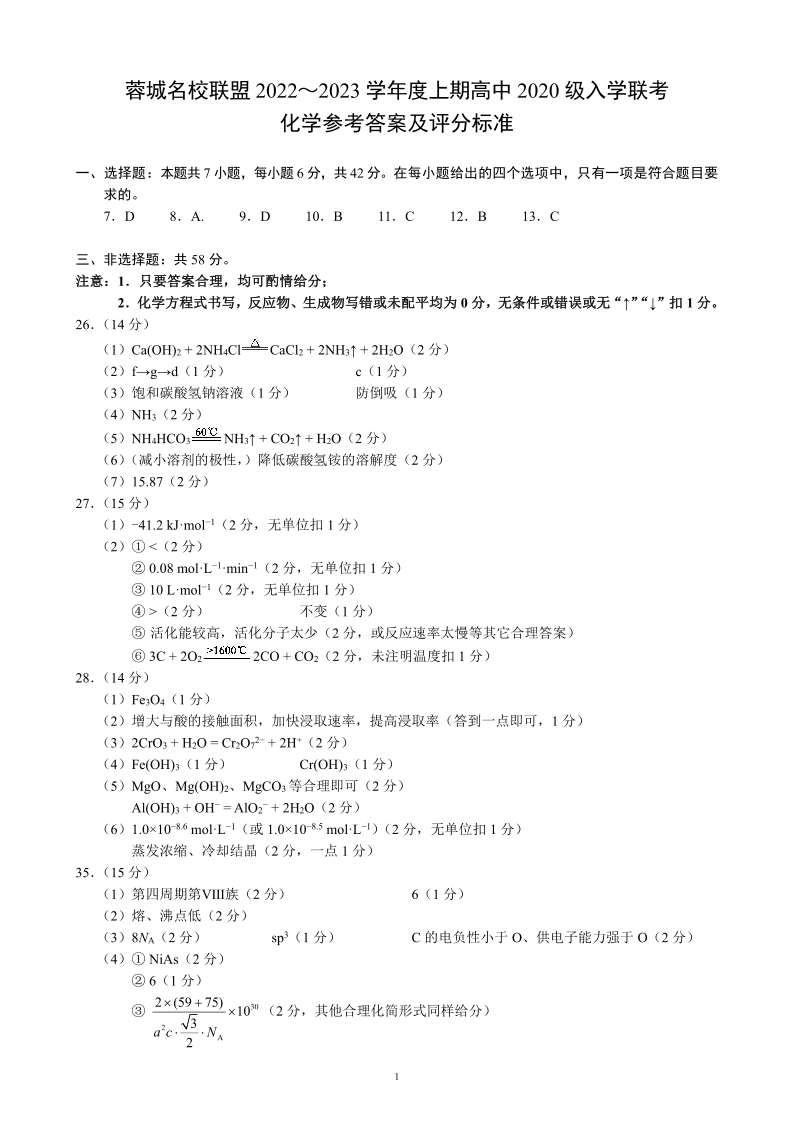 高三理综化学答案--四川省蓉城名校联盟23届高三上学期入学联考