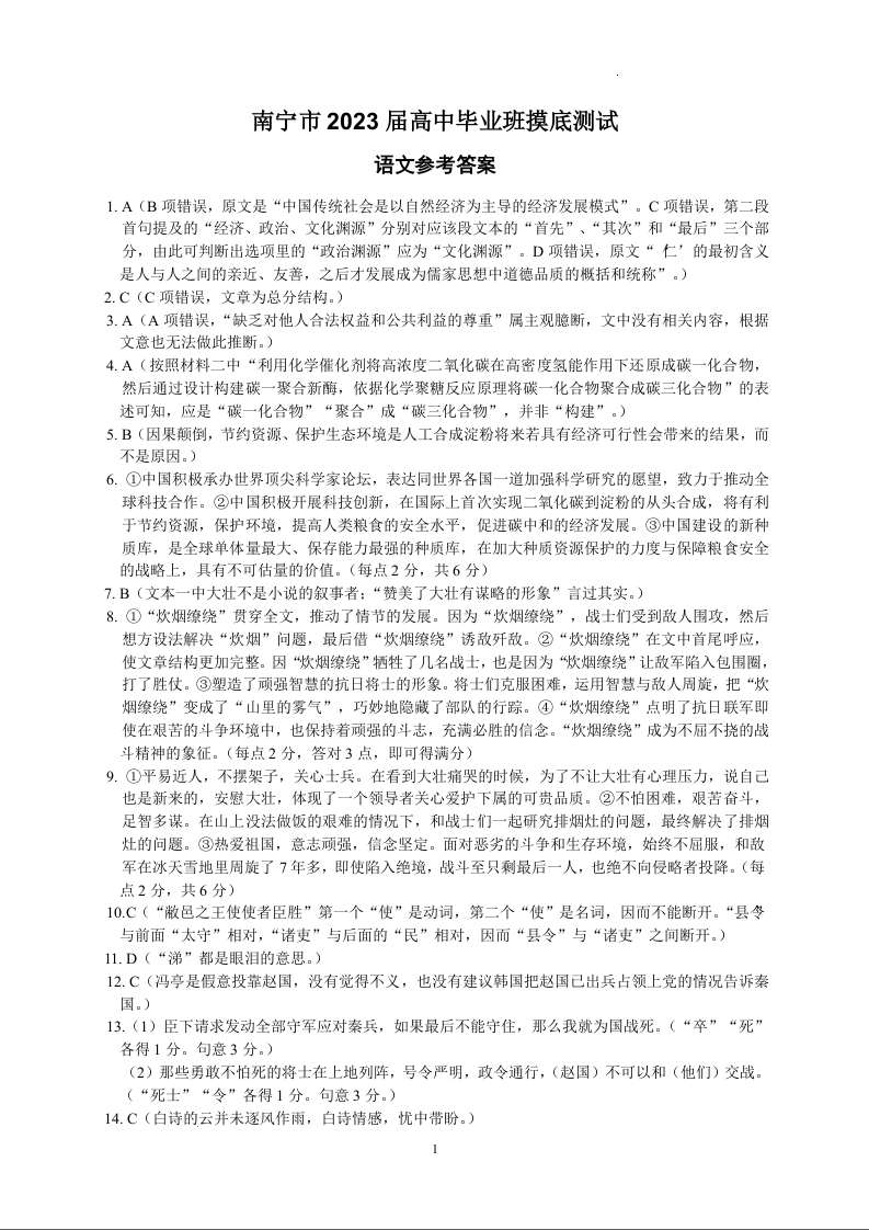 高三语文答案--广西南宁市2023届高三上学期毕业班摸底测试