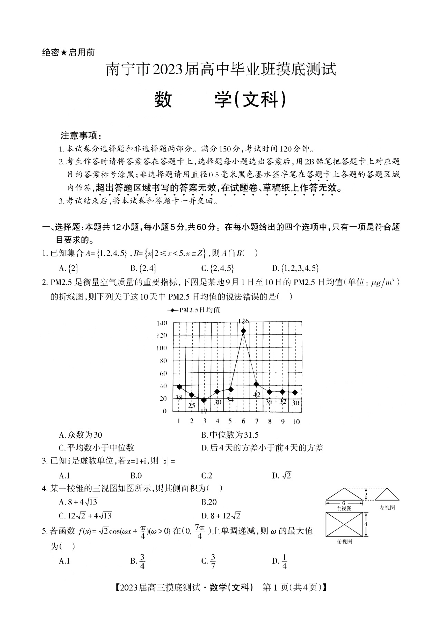高三文数--广西南宁市2023届高三上学期毕业班摸底测试