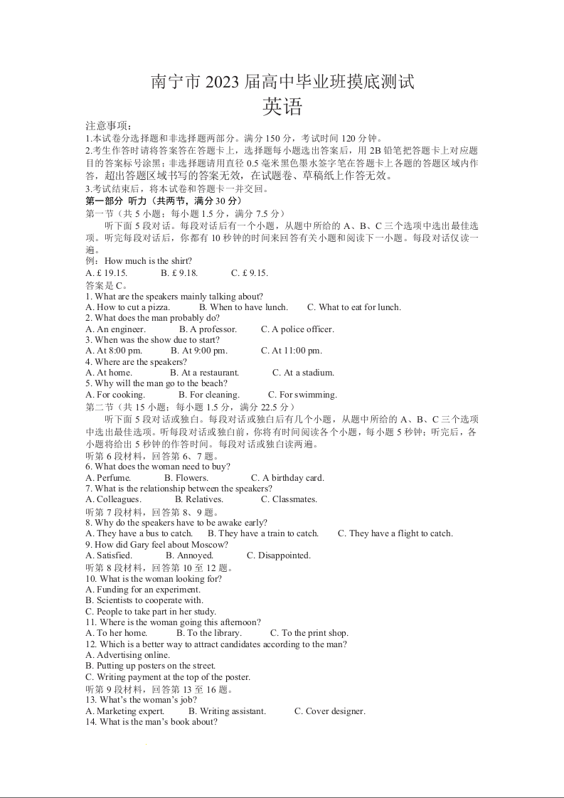 高三英语+答案--广西南宁市2023届高三上学期毕业班摸底测试