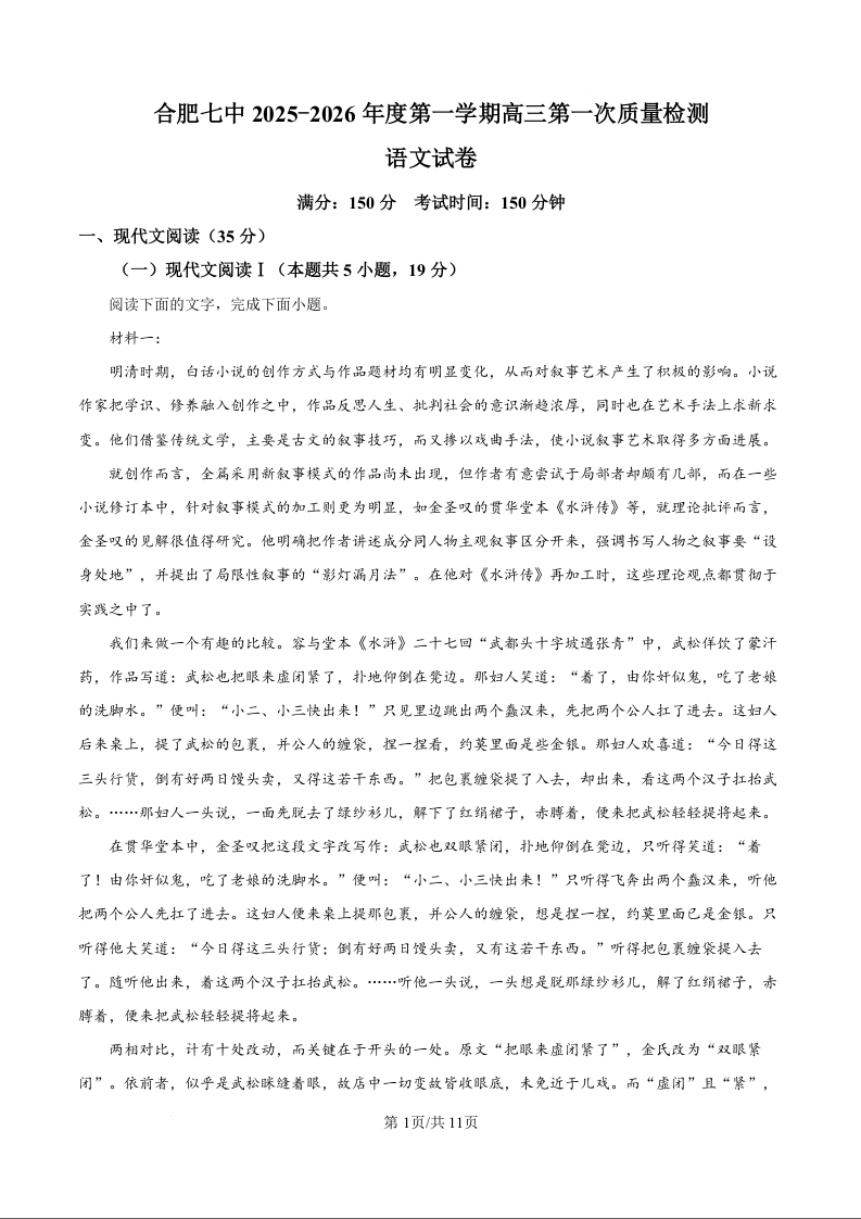 高三语文(原卷版)--安徽省合肥市第七中学2026届高三上学期第一次质量检测
