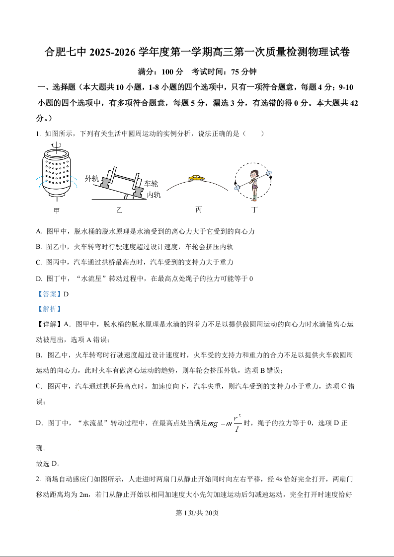 高三物理(精品解析版)--安徽省合肥市第七中学2026届高三上学期第一次质量检测