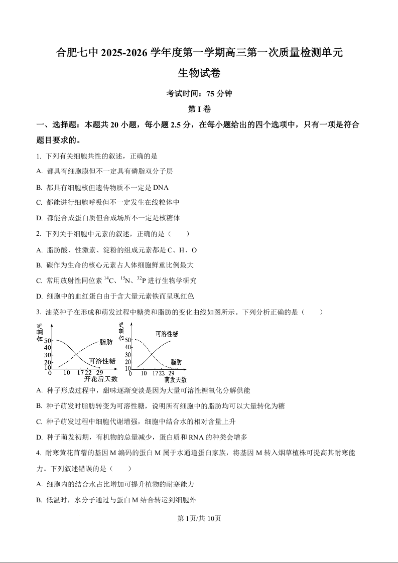 高三生物(原卷版)--安徽省合肥市第七中学2026届高三上学期第一次质量检测