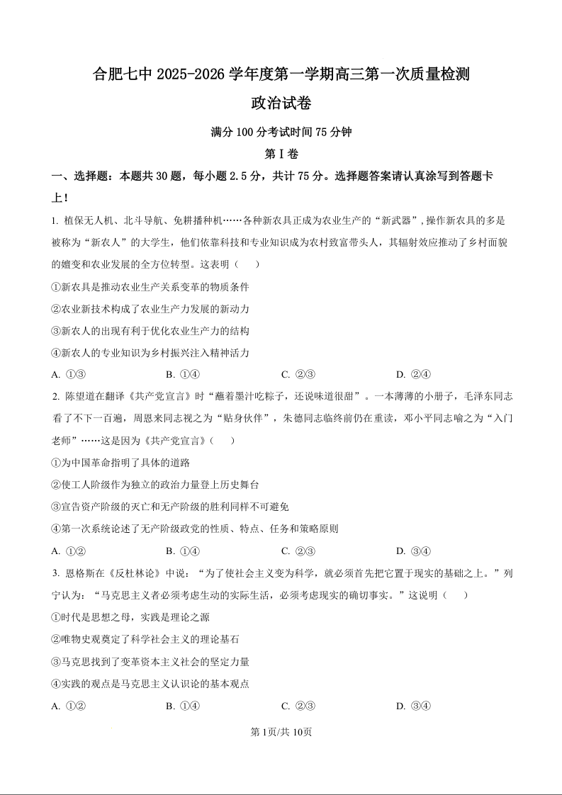 高三政治(原卷版)--安徽省合肥市第七中学2026届高三上学期第一次质量检测