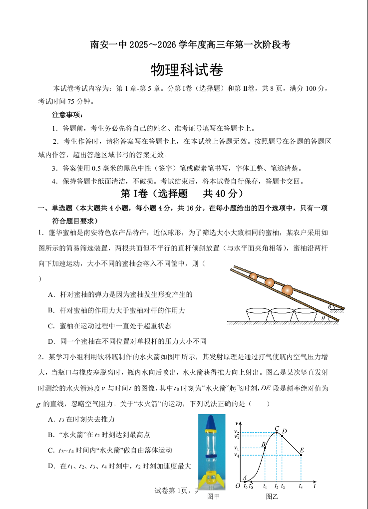 高三物理+答案--福建省泉州市南安第一中学2026届高三上学期第一次段考