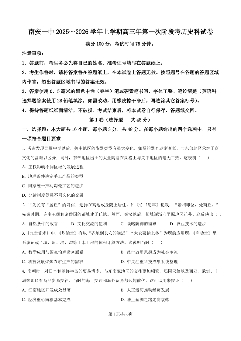 高三历史(原卷版)--福建省泉州市南安第一中学2026届高三上学期第一次段考