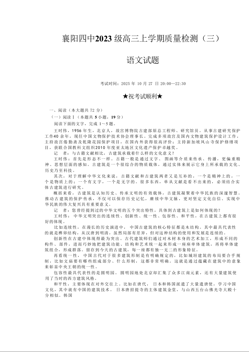 高三语文+答案--湖北省襄阳市第四中学2026届高三上学期10月月考