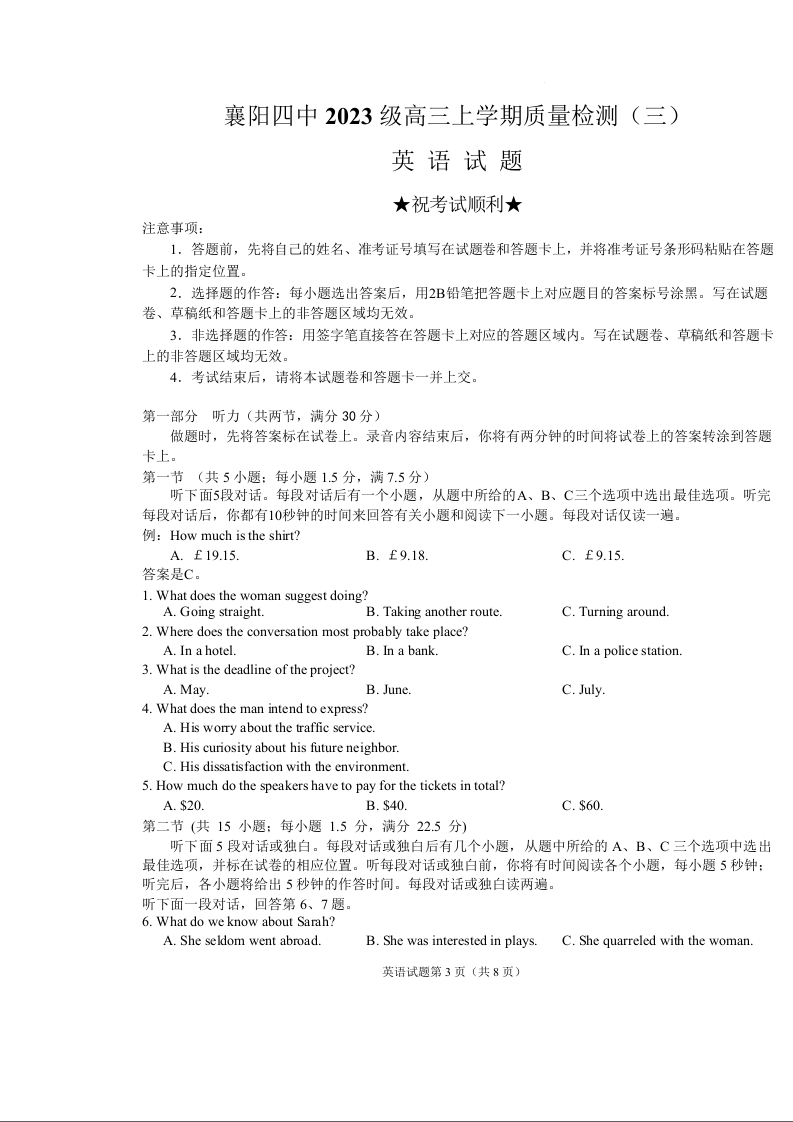 高三英语+答案--湖北省襄阳市第四中学2026届高三上学期10月月考