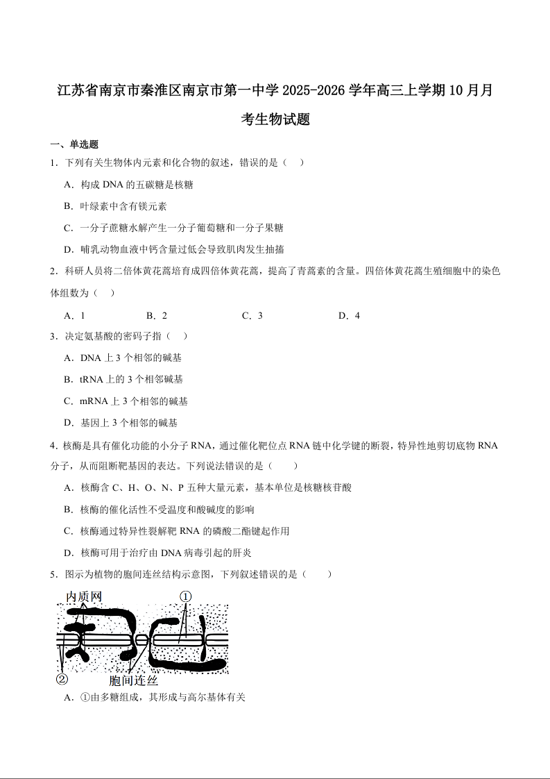 高三生物+答案--江苏省南京市第一中学2026届高三上学期10月月考