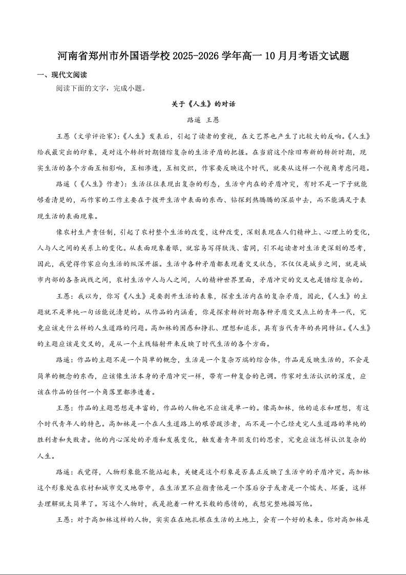 高一语文+答案--河南省郑州外国语学校2025-2026学年高一上学期10月月考试题