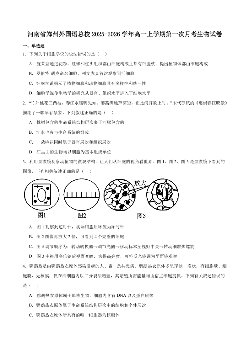 高一生物+答案--河南省郑州外国语学校2025-2026学年高一上学期10月月考试题