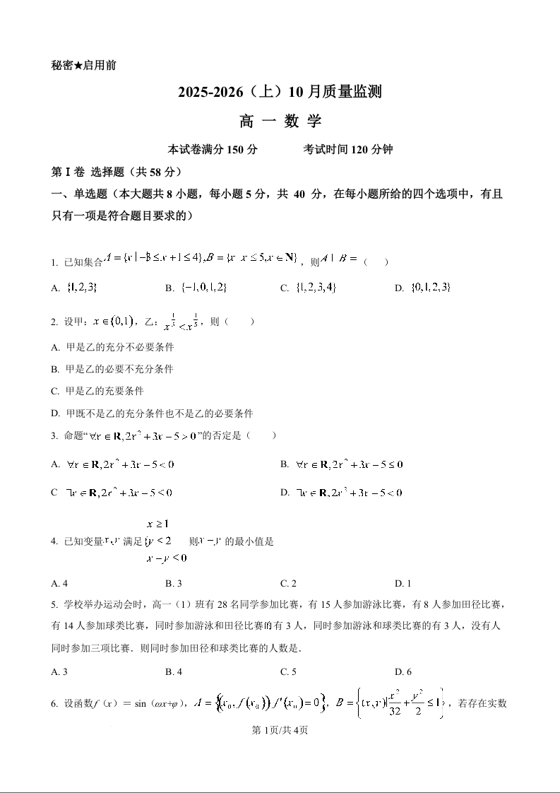 高一数学(原卷版)--辽宁省沈文新高考研究联盟2025-2026学年高一上学期10月质量监测