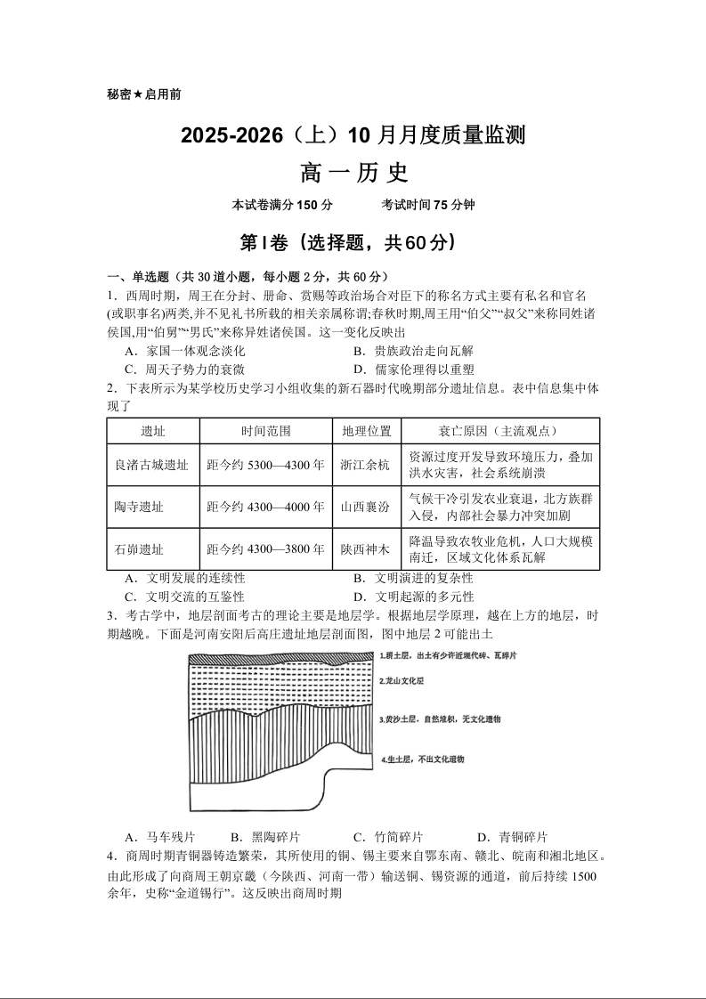 高一历史--辽宁省沈文新高考研究联盟2025-2026学年高一上学期10月质量监测