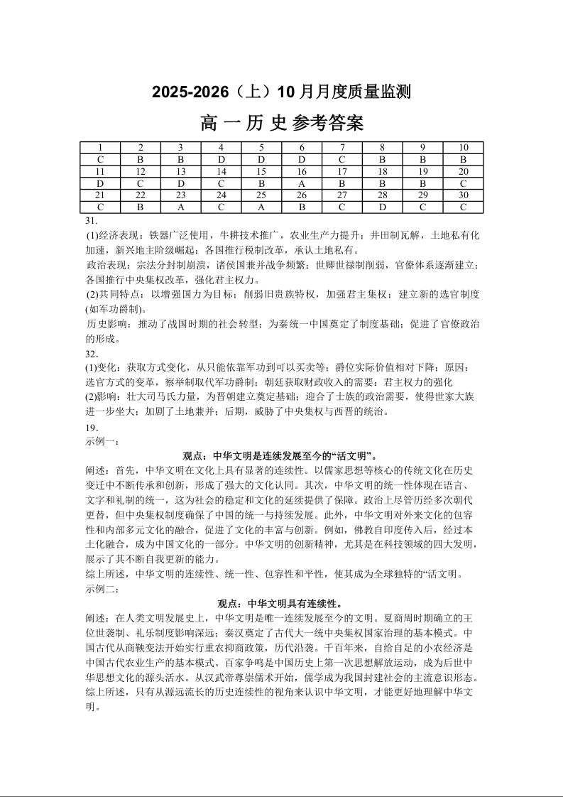 高一历史答案--辽宁省沈文新高考研究联盟2025-2026学年高一上学期10月质量监测