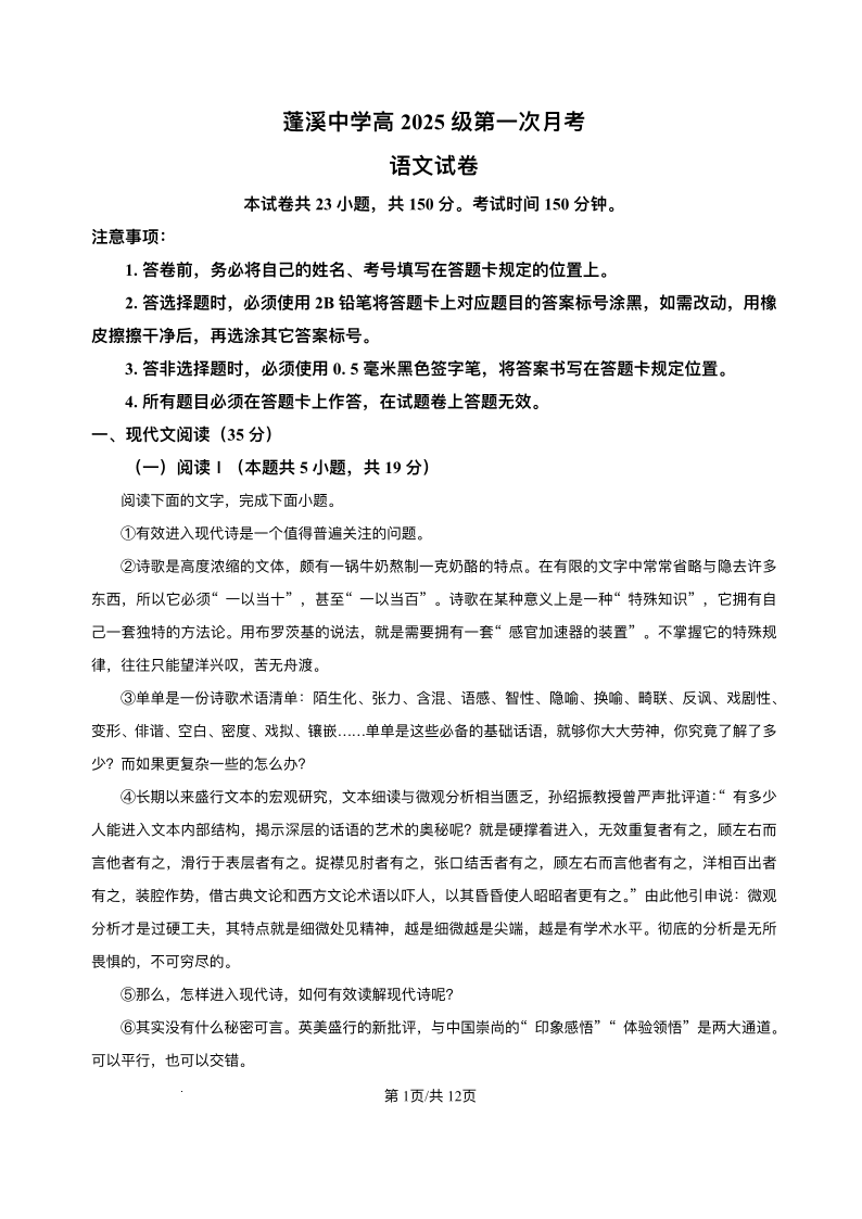 高一语文+答案--四川省遂宁市蓬溪中学2025-2026学年高一上学期10月月考