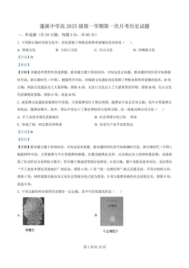 高一历史(解析版)--四川省遂宁市蓬溪中学2025-2026学年高一上学期10月月考