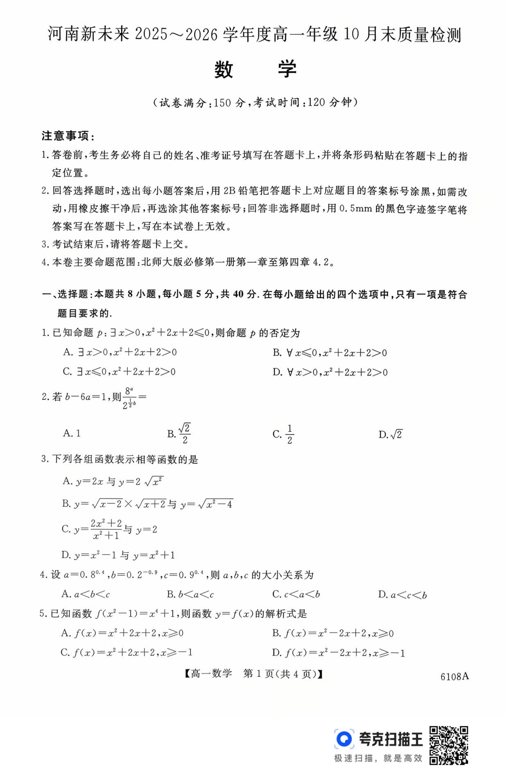 高一数学--河南省新未来大联考2025-2026学年高一上学期10月末质量检测