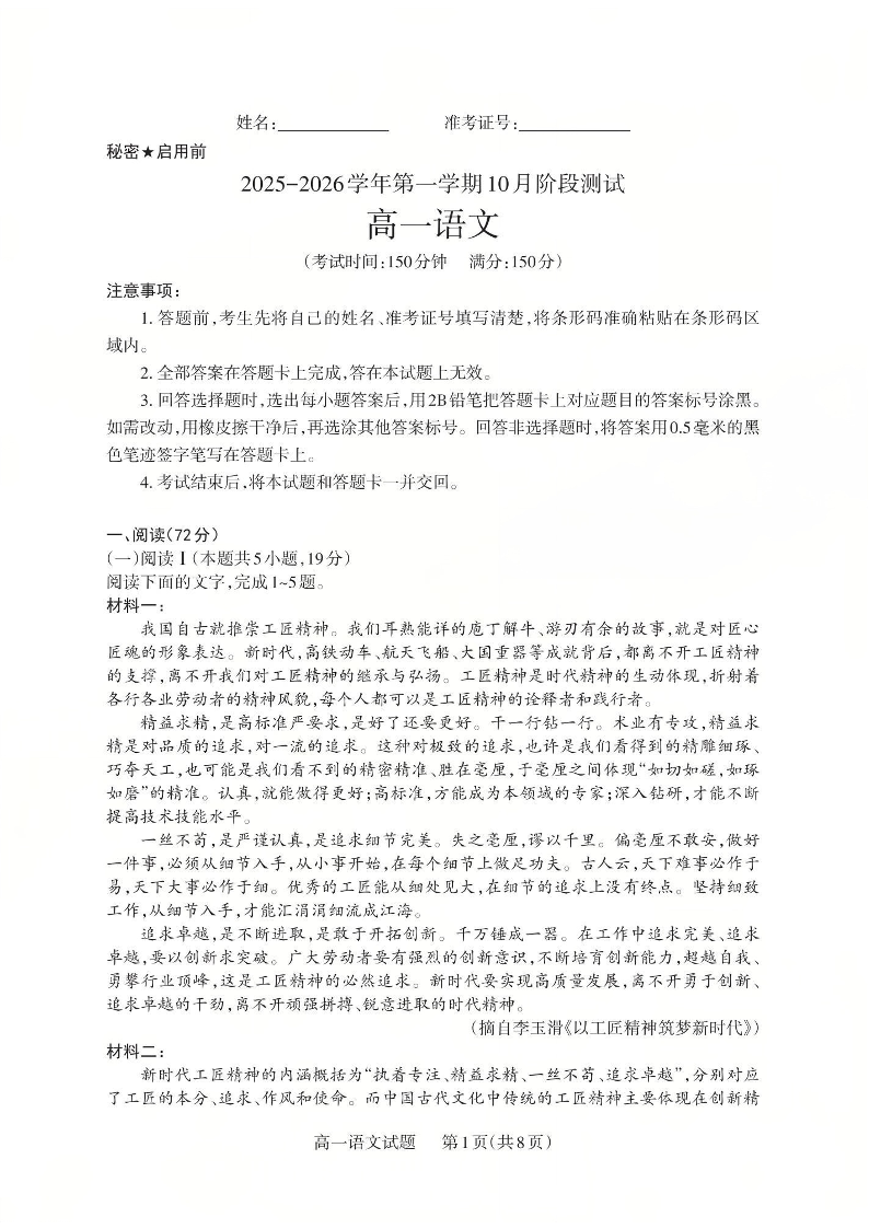 高一语文--山西省2025-2026学年高一第一学期10月阶段测试