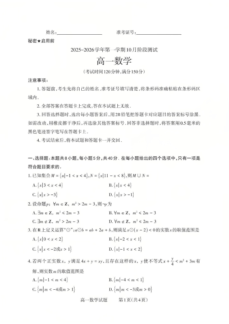 高一数学--山西省2025-2026学年高一第一学期10月阶段测试
