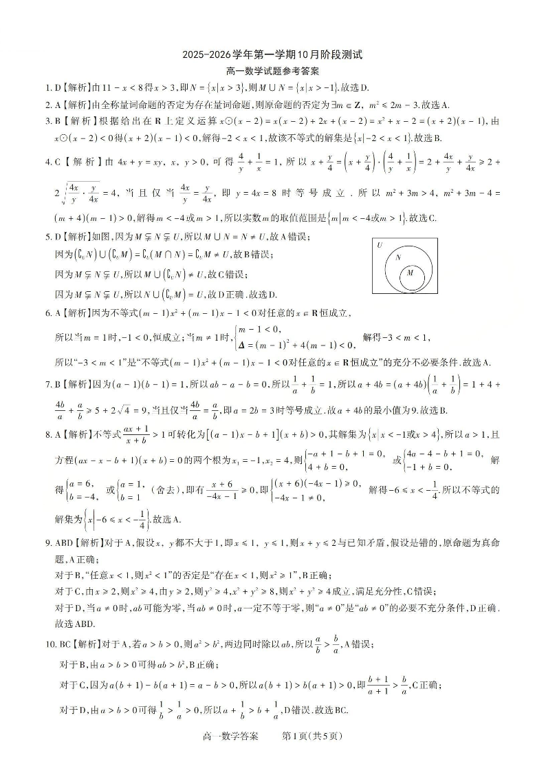 高一数学答案--山西省2025-2026学年高一第一学期10月阶段测试
