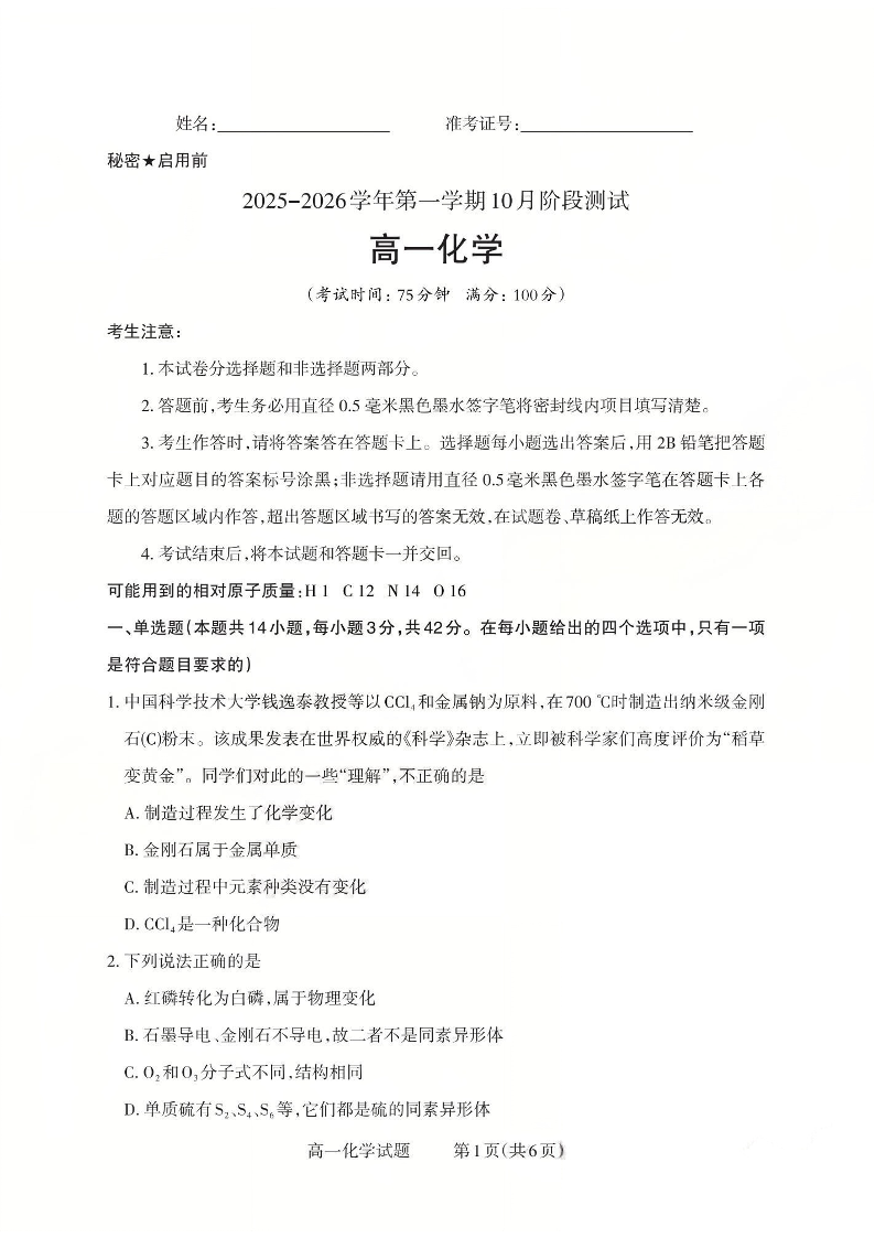 高一化学--山西省2025-2026学年高一第一学期10月阶段测试