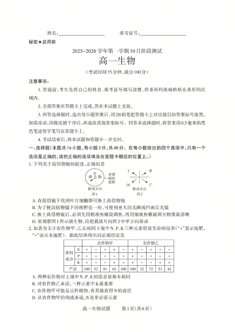 高一生物--山西省2025-2026学年高一第一学期10月阶段测试