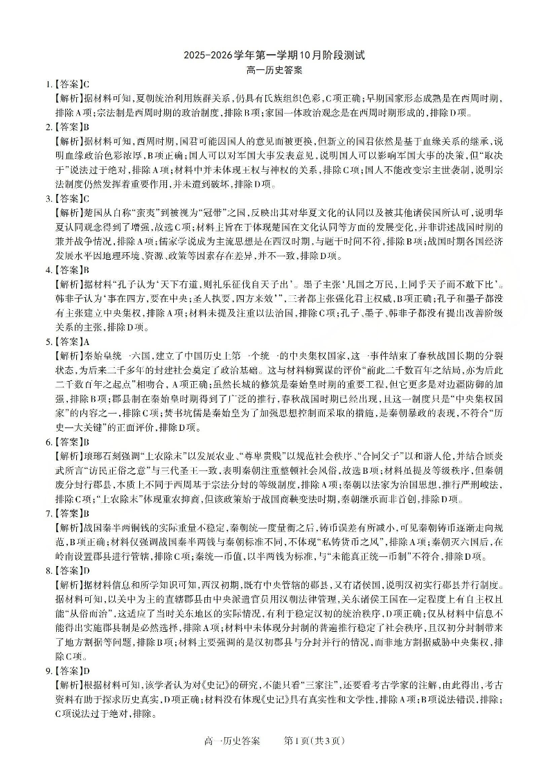 高一历史答案--山西省2025-2026学年高一第一学期10月阶段测试