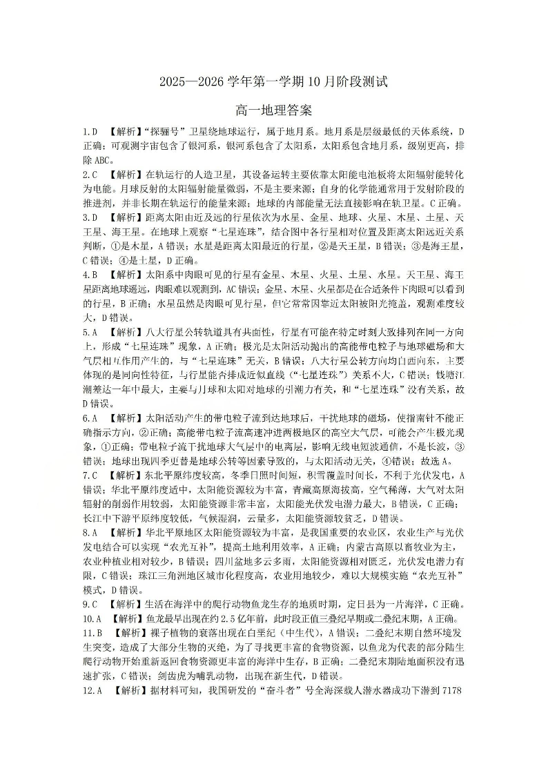高一地理答案--山西省2025-2026学年高一第一学期10月阶段测试