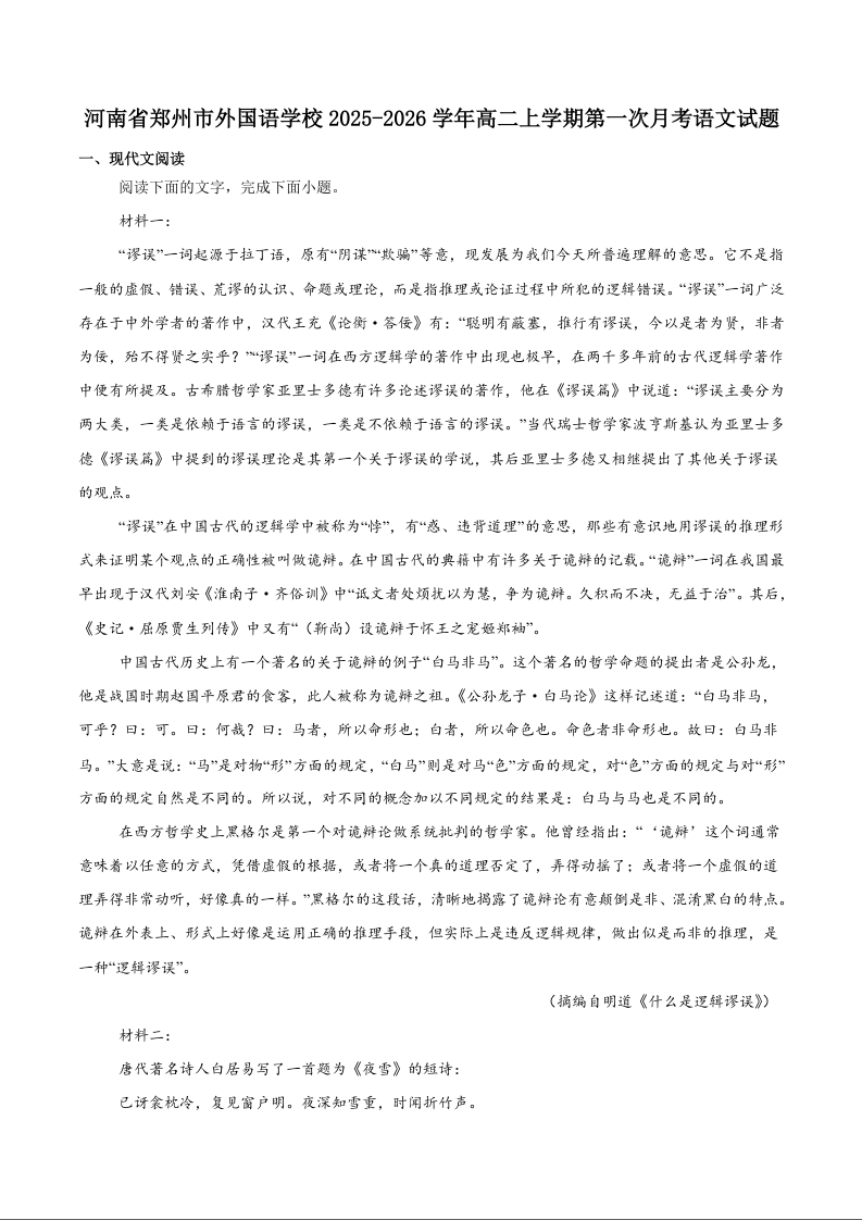 高二语文+答案--河南省郑州外国语学校2025-2026学年高二上学期10月月考试题