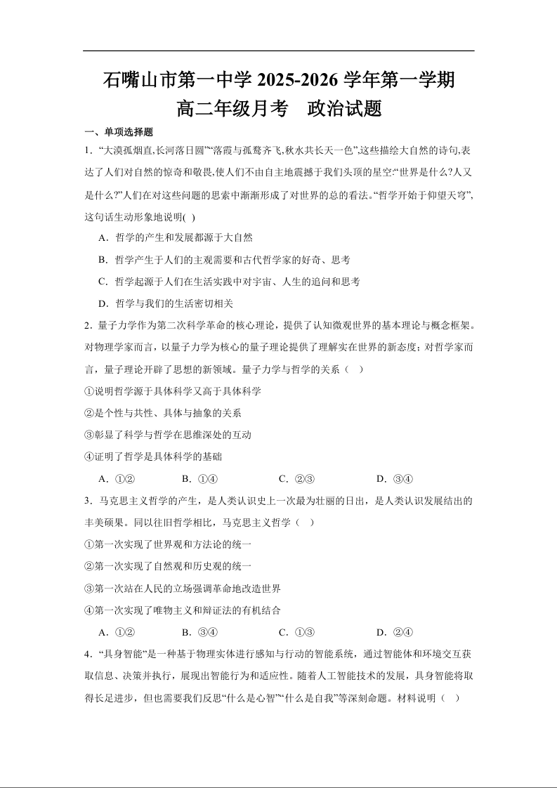 高二政治答案--宁夏回族自治区石嘴山市第一中学2025-2026学年高二上学期10月月考