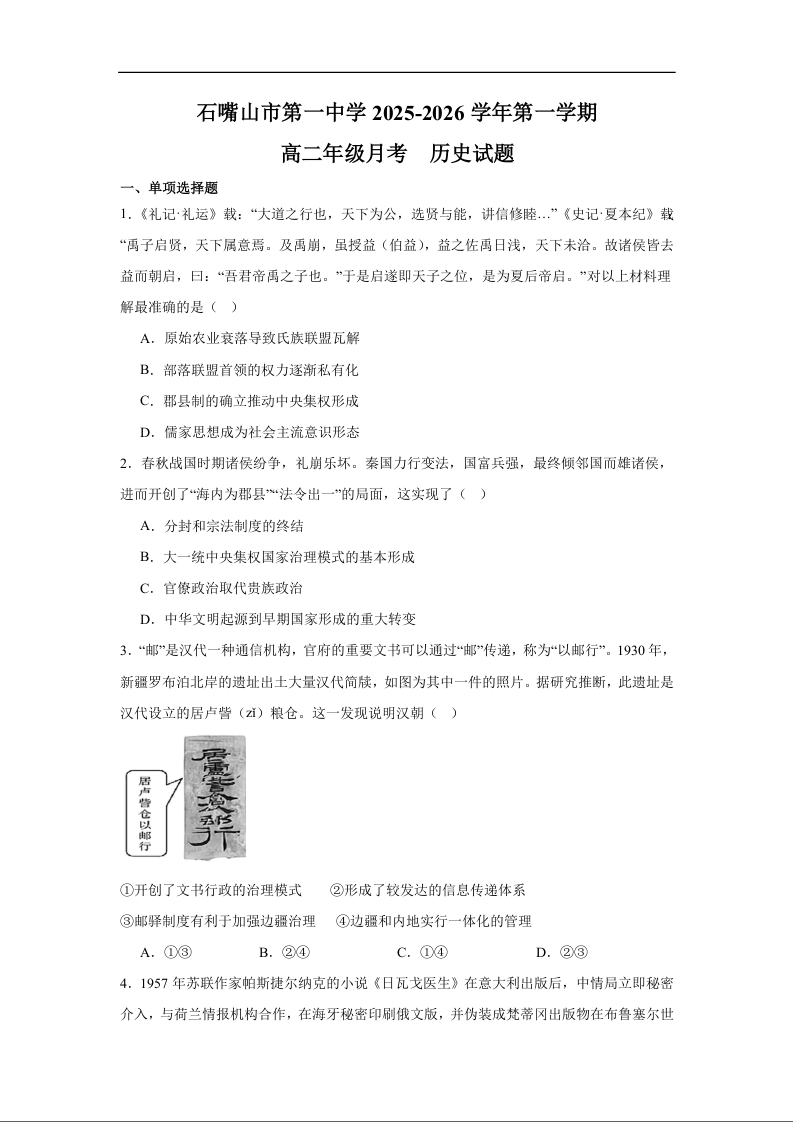 高二历史--宁夏回族自治区石嘴山市第一中学2025-2026学年高二上学期10月月考