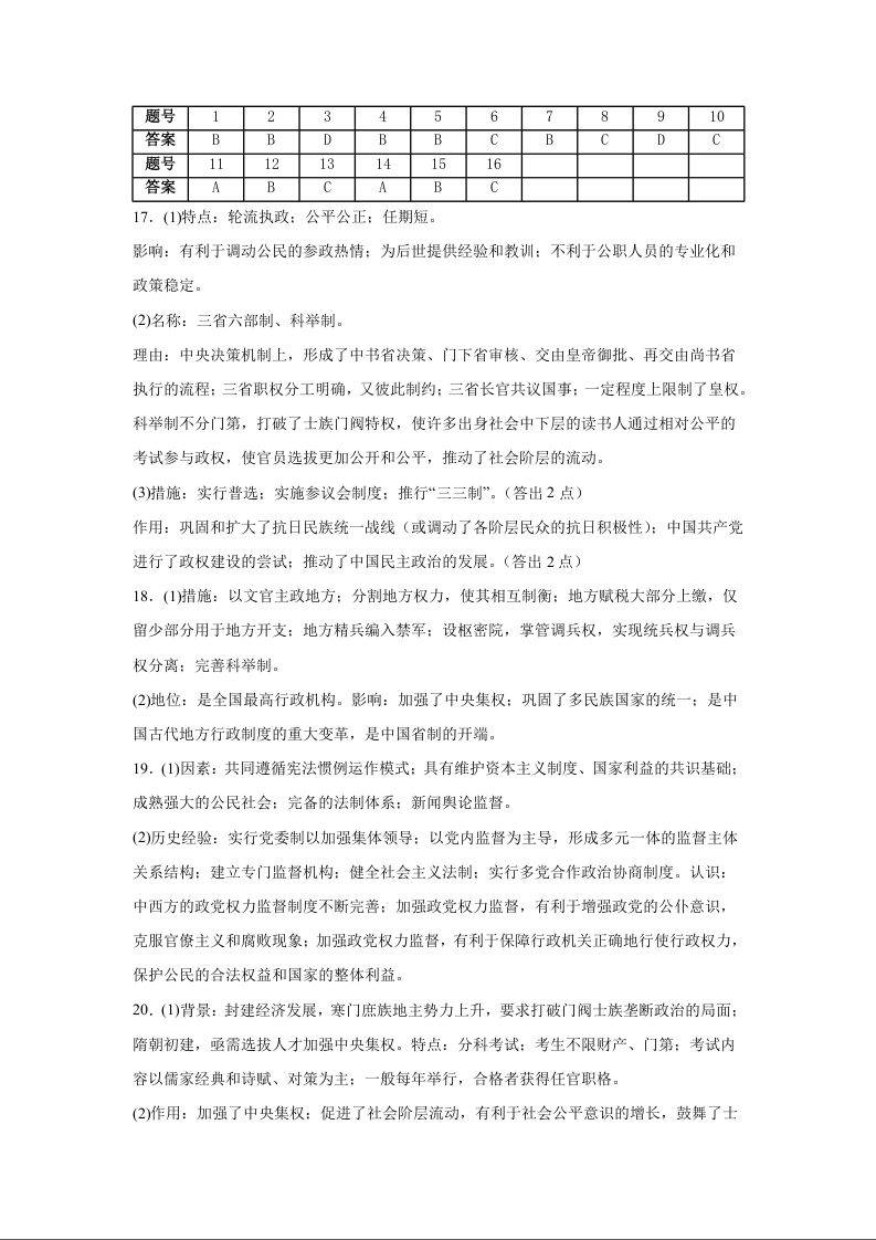 高二历史答案--宁夏回族自治区石嘴山市第一中学2025-2026学年高二上学期10月月考
