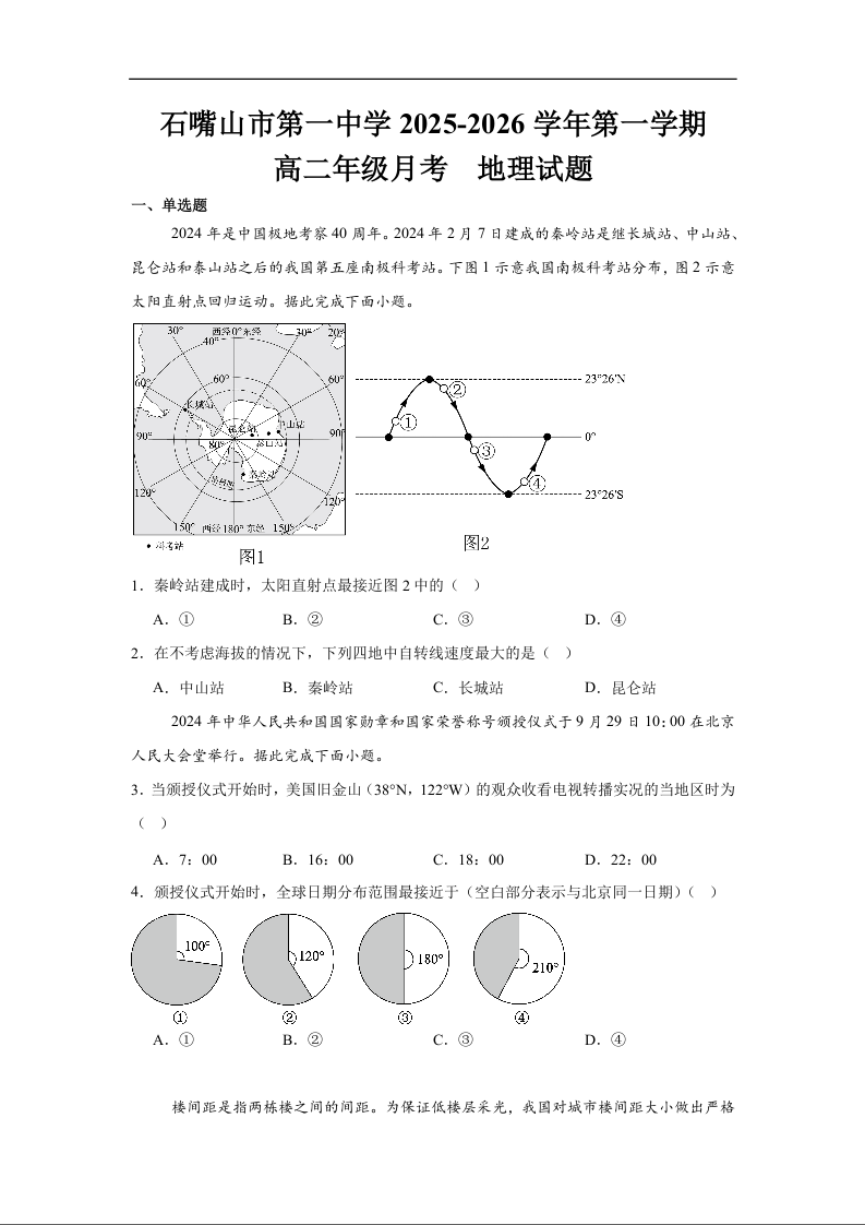 高二地理--宁夏回族自治区石嘴山市第一中学2025-2026学年高二上学期10月月考