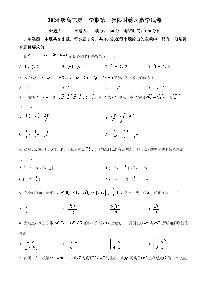 高二数学(原卷版)--安徽省合肥市第七中学2025-2026学年高二上学期第一次月考