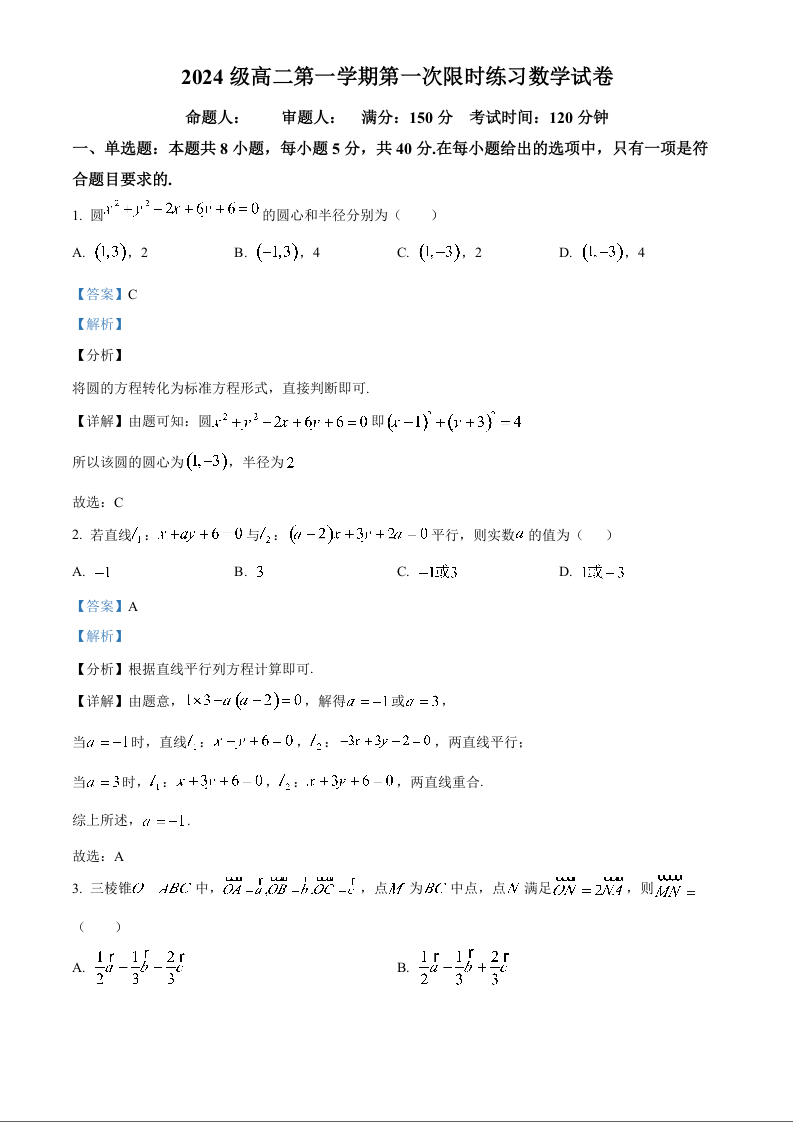 高二数学(解析版)--安徽省合肥市第七中学2025-2026学年高二上学期第一次月考