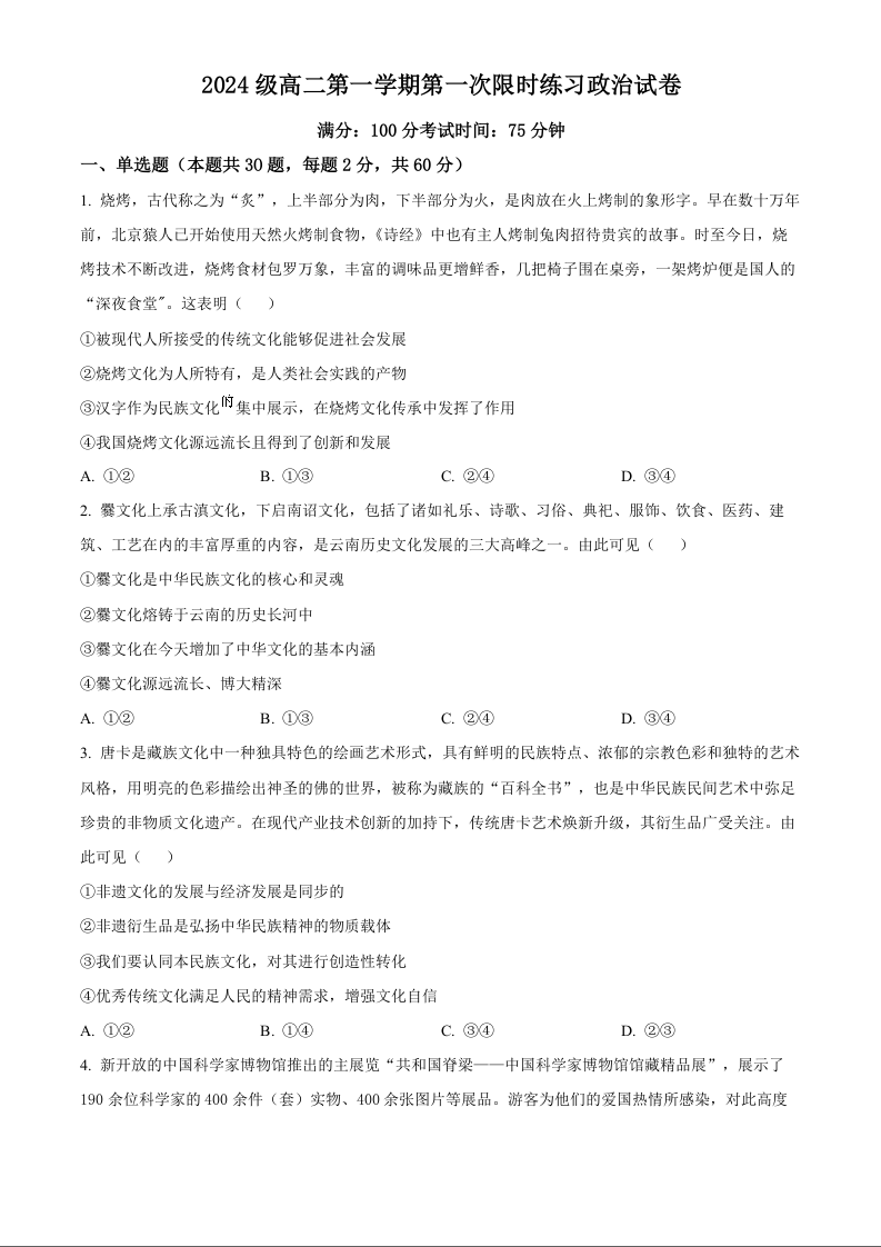 高二政治(原卷版)--安徽省合肥市第七中学2025-2026学年高二上学期第一次月考